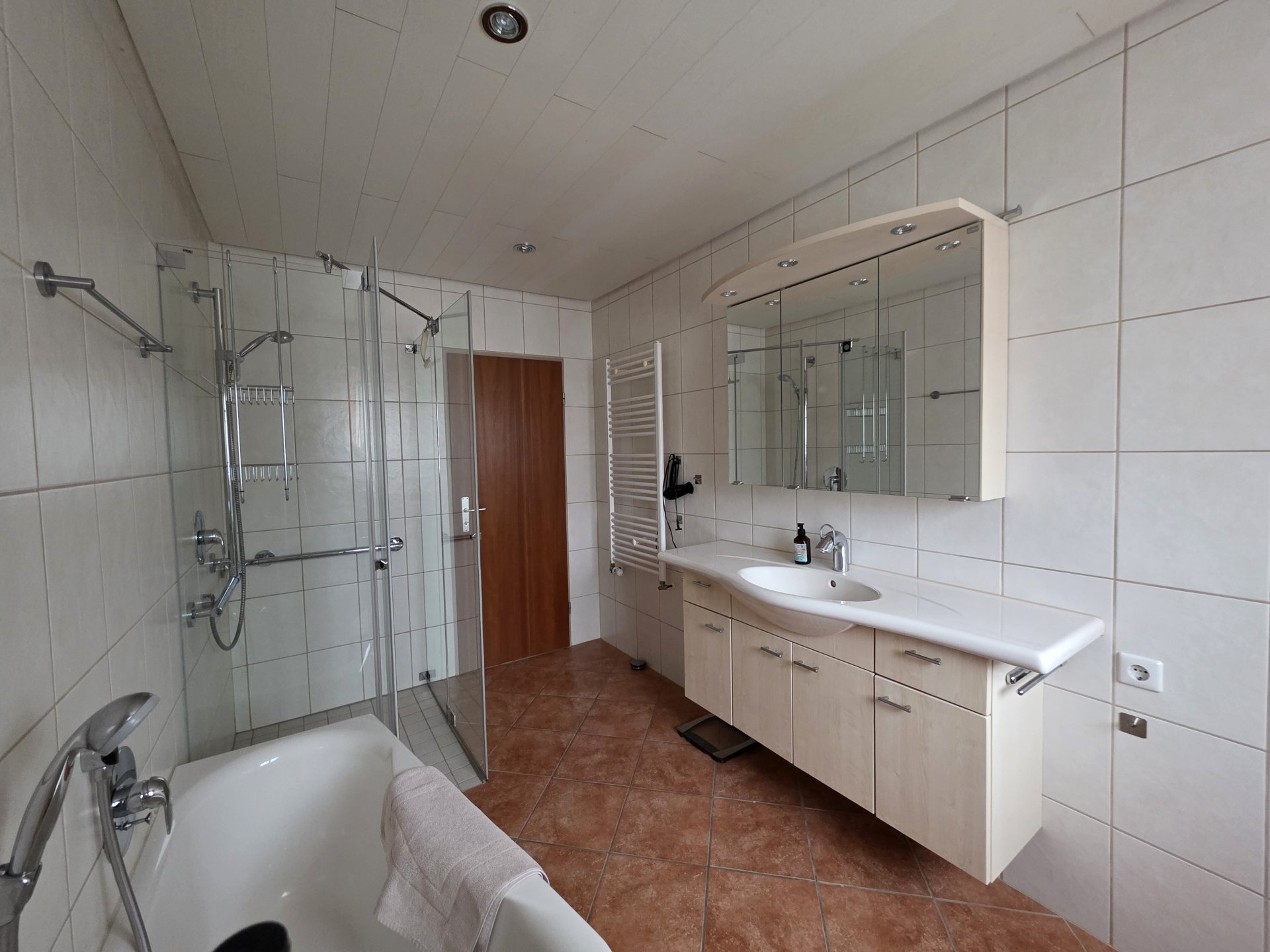 Das großzügige Badezimmer wurde 2006 vollständig renoviert und ist barrierefrei gestaltet. Es verfügt über eine Dusche, eine Badewanne, ein WC, ein Tageslichtfenster sowie einen Spiegelschrank und einen Handtuchheizkörper. Die festen Haltegriffe in der DU, Stützklappgriffe am WC für das Aufstehen sowie ausreichend Bewegungsfläche erleichtern vieles in diesem Badezimmer.